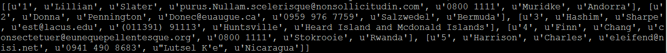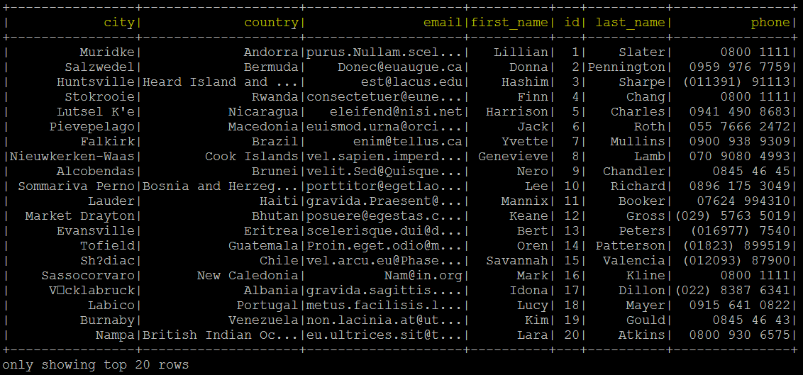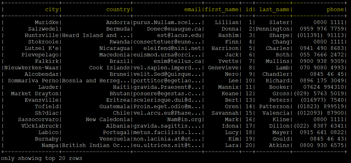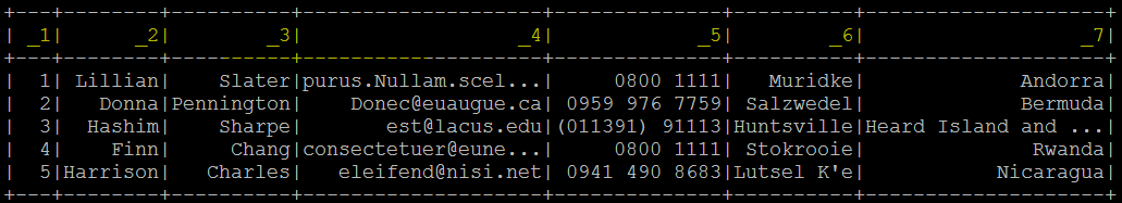 id,first_name,last_name,email,phone,city,country 1,Lillian,Slater,purus.Nullam.scelerisque@nonsollicitudin.com,0800 1111,Muridke,Andorra 2,Donna,Pennington,Donec@euaugue.ca,0959 976 7759,Salzwedel,Bermuda 3,Hashim,Sharpe,est@lacus.edu,(011391) 91113,Huntsville,Heard Island and Mcdonald Islands 4,Finn,Chang,consectetuer@eunequepellentesque.org,0800 1111,Stokrooie,Rwanda 5,Harrison,Charles,eleifend@nisi.net,0941 490 8683,Lutsel K'e,Nicaragua 6,Jack,Roth,euismod.urna@orciin.net,055 7666 2472,Pievepelago,Macedonia 7,Yvette,Mullins,enim@tellus.ca,0900 938 9309,Falkirk,Brazil 8,Genevieve,Lamb,vel.sapien.imperdiet@Etiam.net,070 9080 4993,Nieuwkerken-Waas,Cook Islands 9,Nero,Chandler,velit.Sed@Quisque.org,0845 46 45,Alcobendas,Brunei 10,Lee,Richard,porttitor@egetlaoreetposuere.ca,0896 175 3049,Sommariva Perno,Bosnia and Herzegovina
