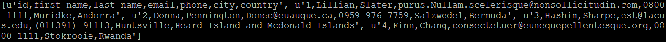 # Map in Data Frame >>> from pyspark.sql import Row >>> textDataDF = textDataDF.map(lambda x: Row(id = x[0], first_name = x[1], last_name = x[2], email = x[3], phone = x[4], city = x[5], country = x[6])).toDF()